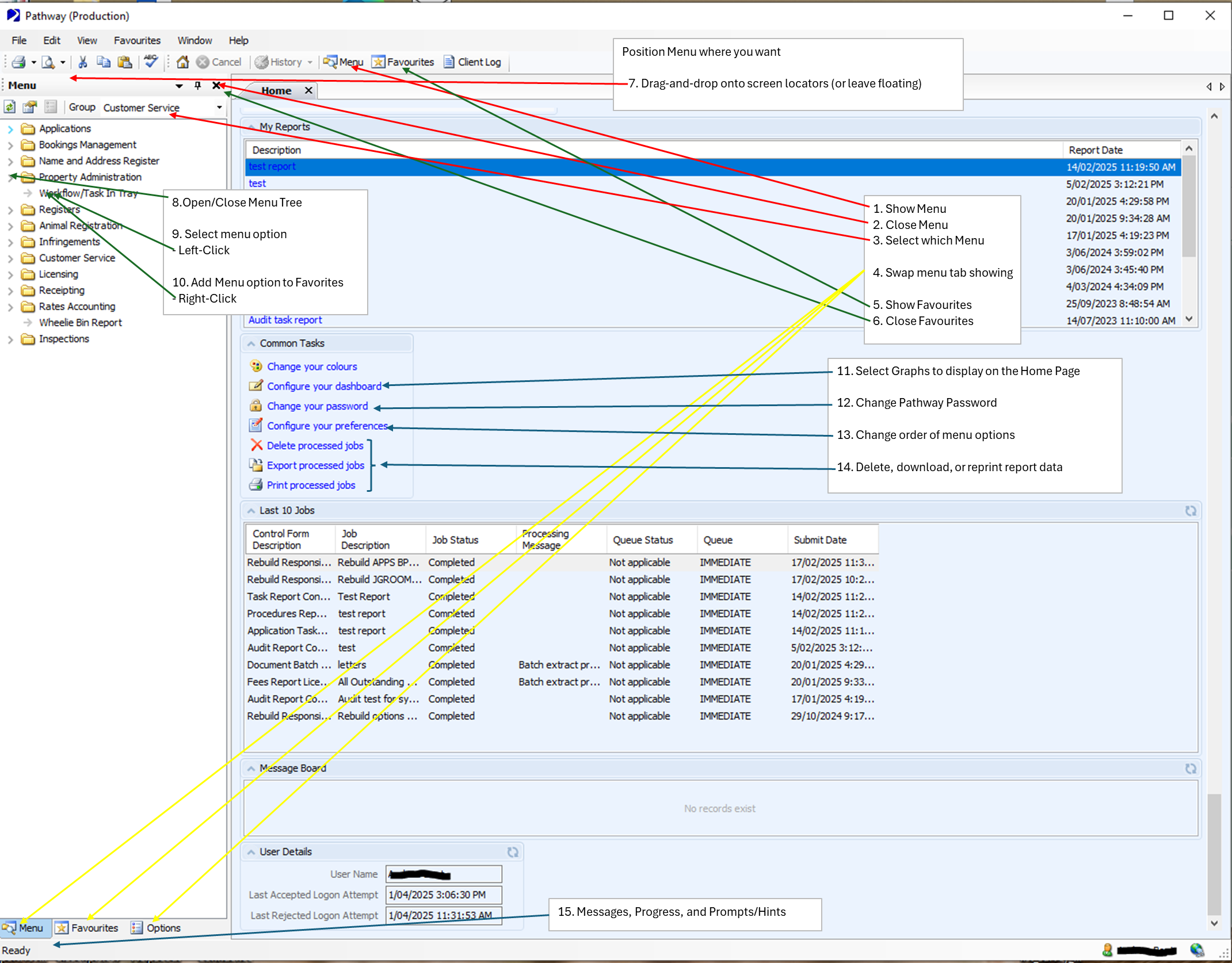 Pathway menus are organised around the various modules of Pathway, such as working with Customer Service and Depot Requests, Planning Applications, Building/Plumbing Applications, Health Licensing, Compliance Infringements. You will be assigned a set (or one) menu to work with your role. Contact your Pathway Admin or log a request to change access.