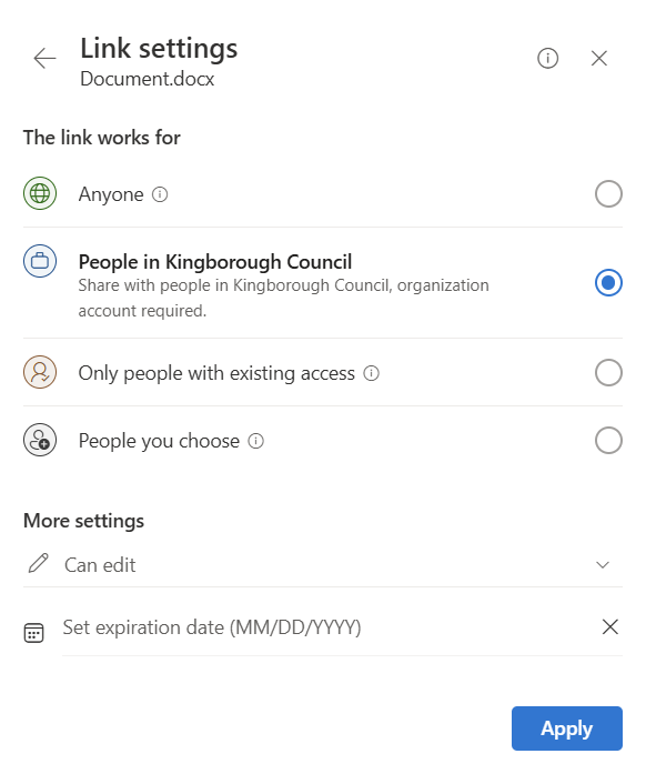 - Gives access to any staff member at Kingborough Council who receives the link.