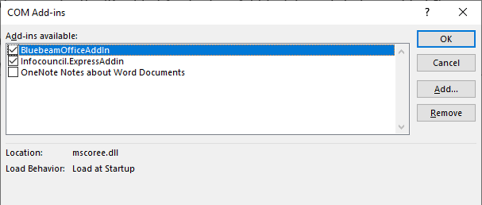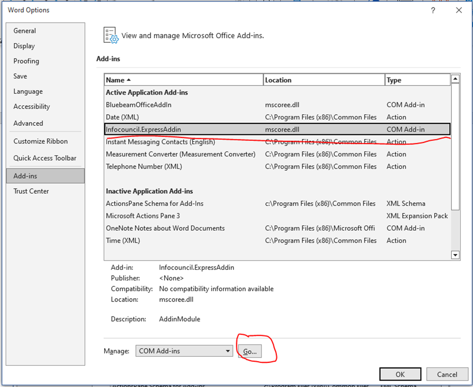 - Ensure Infocouncil.ExpressAddin is listed under: