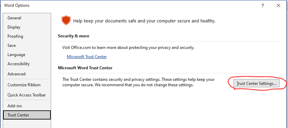 File → Options → Trust Center → Trust Center Settings